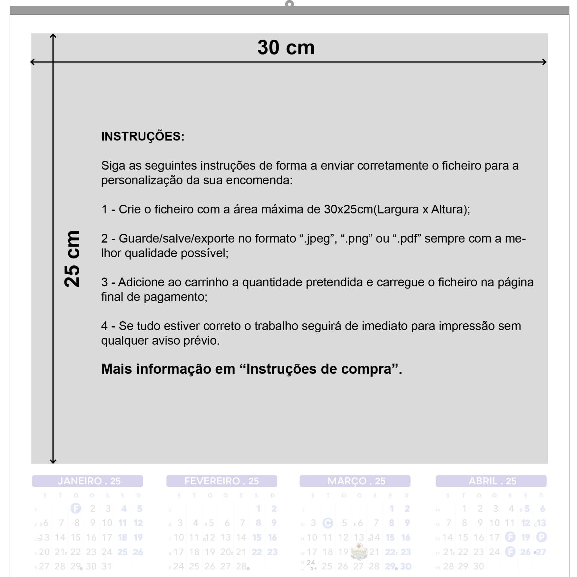 - A impressão será a cores (cmyk digital) em papel revestido branco 200g. O(a) Cliente apenas terá que enviar o ficheiro na medida correta e com a melhor qualidade possível, sendo que os meses do calendário e o suporte para pendurar na parede é aplicado por nós.