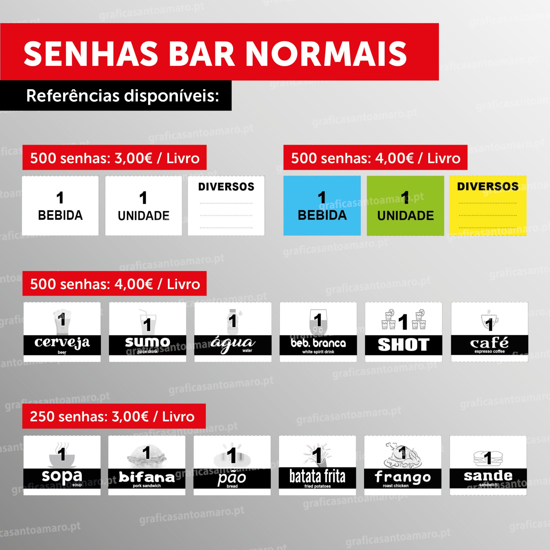 Opções de referências: "1 BEBIDA" | "1 UNIDADE" | "DIVERSOS" | "1 CERVEJA" | "1 SUMO" | "1 ÁGUA" | "1 BEB. BRANCA" | "1 SHOT" | "1 CAFÉ" | "1 SOPA" | "1 BIFANA" | "1 PÃO" | "1 BATATA FRITA" | "1 FRANGO" | "1 SANDE" - veja exemplos nas imagens do produto.